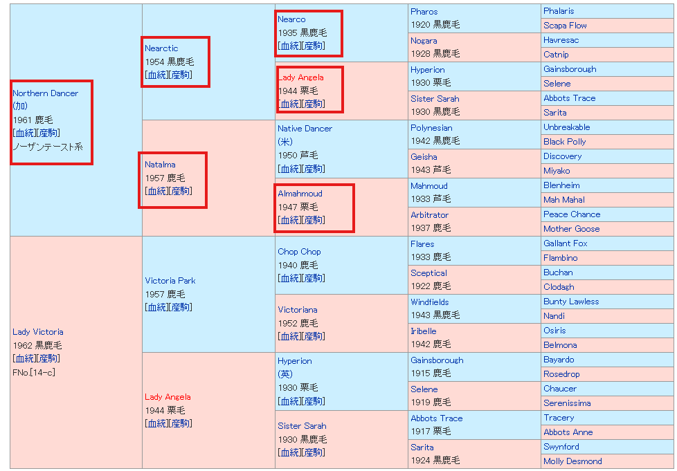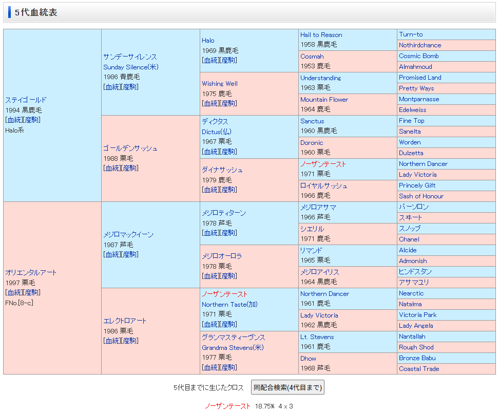 5代目以内はHail to Reason だが父方は8代目まで下がっており、あまり影響はしていない。最上位クロスはNorthern Dancerで6代目から多重クロス。しかもこのNorthern Dancerはノーザンテーストが入るためNearctic が全開- 父Nearco 母 Lady Angela のどちらも協調される。