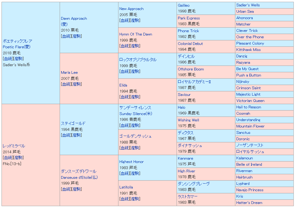 ポエティックフレアは産駒内でNorthern Dancerがクロスするとラインクロスが発生する構造になっており、配合としては優秀な産駒を送りだせるはずであるのであるが、日本の馬場においてNorthern Dancerの母Natalmaが影響を強く発揮すると何故だか好成績を残せていない。Natalmaのクロスを持つデインヒル系の種牡馬が軒並み苦戦しているのが証明になっている。NatalmaはNative Dancerの娘で日本向きのきれのあるスピードではなくアメリカのスピードがありながらも消耗戦持久力勝負の血であって、日本向きではないのが理由とみていいかもしれない。一方Northern Dancerの父であるスピード馬Nearcticのクロスも発生してくる。この血はヒシアマゾンなどで日本実績十分の血なので十分なスピードが得られるのであるが、父 Dawn Approach 産駒の時点でNearcticのクロスは存在しているにもかかわらず Dawn Approach 産駒からはスピードがうまく伝わっっているようには見えない。